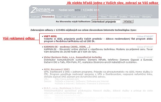 Vďaka ETARGET sa zobrazí Váš reklamný odkaz ľuďom, ktorí hľadajú "Vaše slová". Slová, na ktoré sa Váš reklamný odkaz bude zobrazovať si určujete Vy!